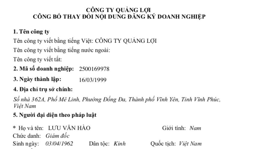 Công ty Quảng Lợi được thành lập vào ngày 16/3/1999, địa chỉ trụ sở tại số nhà 362A, phố Mê Linh, phường Đống Đa, TP Vĩnh Yên, tỉnh Vĩnh Phúc (nay là tỉnh Phú Thọ). Người đại diện theo pháp luật là Lưu Văn Hào, sinh năm 1962, chức vụ Giám đốc.