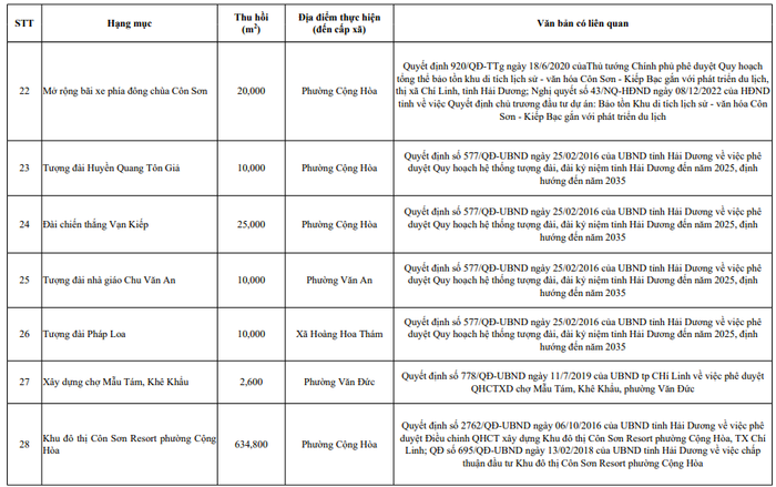 Một số dự án có diện tích đất đề nghị thu hồi lớn là: Khu đô thị Côn Sơn Resort ở phường Cộng Hòa với gần 63,5ha; Khu dân cư mới tại khu phố Hưng Đạo, phường Sao Đỏ 67,5ha (cùng ở TP Chí Linh), cụm công nghiệp Thăng Long ở Thị xã Kinh Môn gần 50ha;…