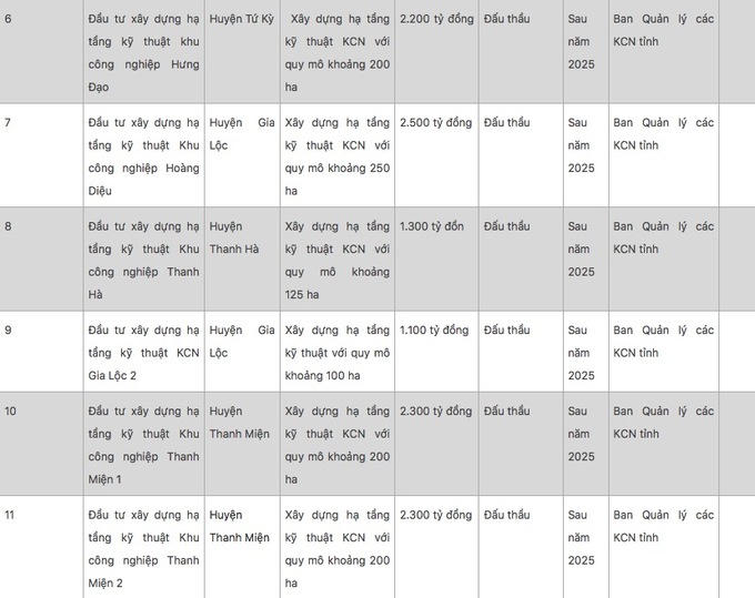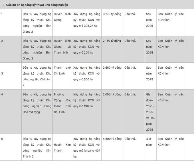 Theo đó, danh sách gồm 22 dự án phân thành 4 nhóm. Trong đó, nhóm các dự án thương mại dịch vụ gồm 3 dự án tổng diện tích 3.073ha; Nhóm các dự án hạ tầng kỹ thuật khu công nghiệp gồm 11 dự án, tổng diện tích 2.505ha. Tổng vốn đầu tư 27.180 tỷ đồng.