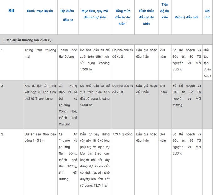 Hình thức đầu tư dự kiến đối với nhóm dự án thương mại dịch vụ là đấu thầu hoặc đấu giá; đối với nhóm hạ tầng kỹ thuật khu công nghiệp là đấu thầu.