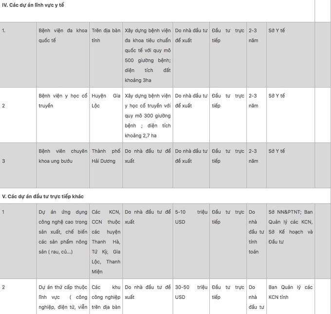 Nhóm các dự án hạ tầng kỹ thuật cụm công nghiệp gồm 3 dự án, tổng diện tích 142,75ha; tổng vốn đầu tư dự kiến hơn 1.400 tỷ đồng; Nhóm các dự án lĩnh vực y tế gồm 3 dự án, diện tích và vốn đầu tư do nhà đầu tư đề xuất; Và các dự án đầu tư trực tiếp khác, tổng vốn đầu tư dự kiến từ 35 – 60 triệu USD.
