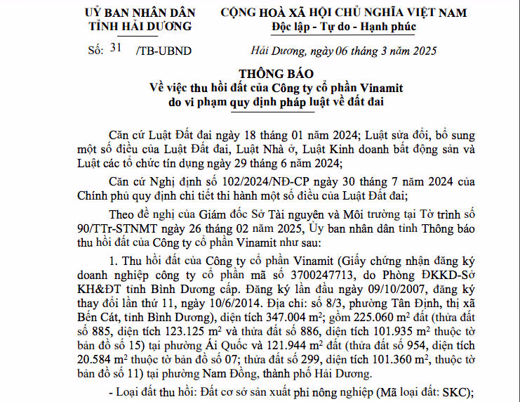 Tỉnh Hải Dương vừa có quyết định thu hồi 34,7ha đất cơ sở sản xuất phi nông nghiệp của CTCP Vinamit do vi phạm luật đất đai.