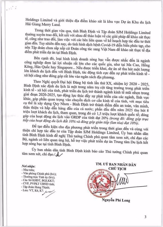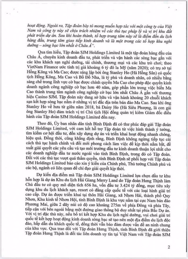 Những nội dung về dự án SJM Holdings đề xuất đầu tư được UBND tỉnh Bình Định đề cập tại văn bản này tương tự dự án Tập đoàn SJM Holdings Ltd đề cập trong văn bản đến Thủ tướng Chính phủ Việt Nam như đã nêu trên.