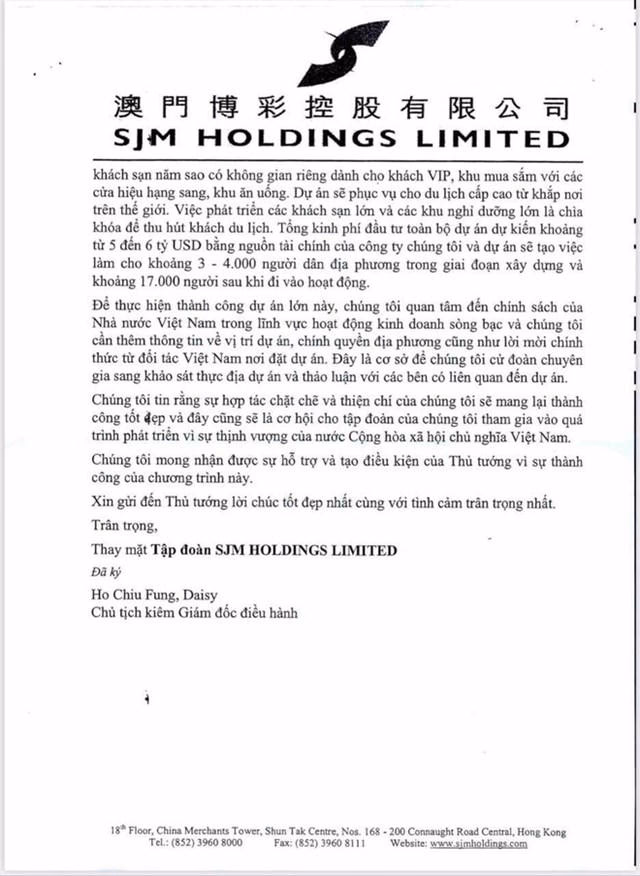 Những ngày qua, một văn bản đang lan truyền trên các diễn đàn, mạng xã hội được, được báo chí đăng tải được cho cho là của Tập đoàn SJM Holdings Ltd gửi đến Thủ tướng Chính phủ Việt Nam để bày tỏ mong muốn hợp tác với một công ty tại Việt Nam, đầu tư xây dựng và vận hành tổ hợp trung tâm giải trí, nghỉ dưỡng, tài chính, thương mại và sòng bạc “tầm cỡ thế giới tại Việt Nam”.