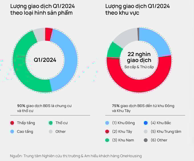 Không khó để nhận thấy thị trường bất động sản Hà Nội đang có 2 cực tăng trưởng chính. Theo OneHousing, trong quý 1/2024, khu Đông và khu Tây Hà Nội chiếm 75% các giao dịch tương đương 14.100 giao dịch.