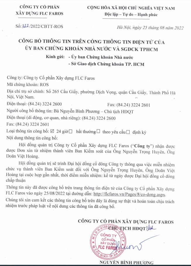 Mới đây, FLC Faros cho biết đã nhận được đơn xin từ nhiệm thành viên Ban Kiểm soát của ông Nguyễn Trọng Huyên và ông Doãn Việt Hoàng. HĐQT sẽ trình đại hội đồng cổ đông FLC Faros thông qua việc miễn nhiệm chức vụ thành viên Ban Kiểm soát đối với ông Huyên và ông Hoàng tại cuộc họp gần nhất.