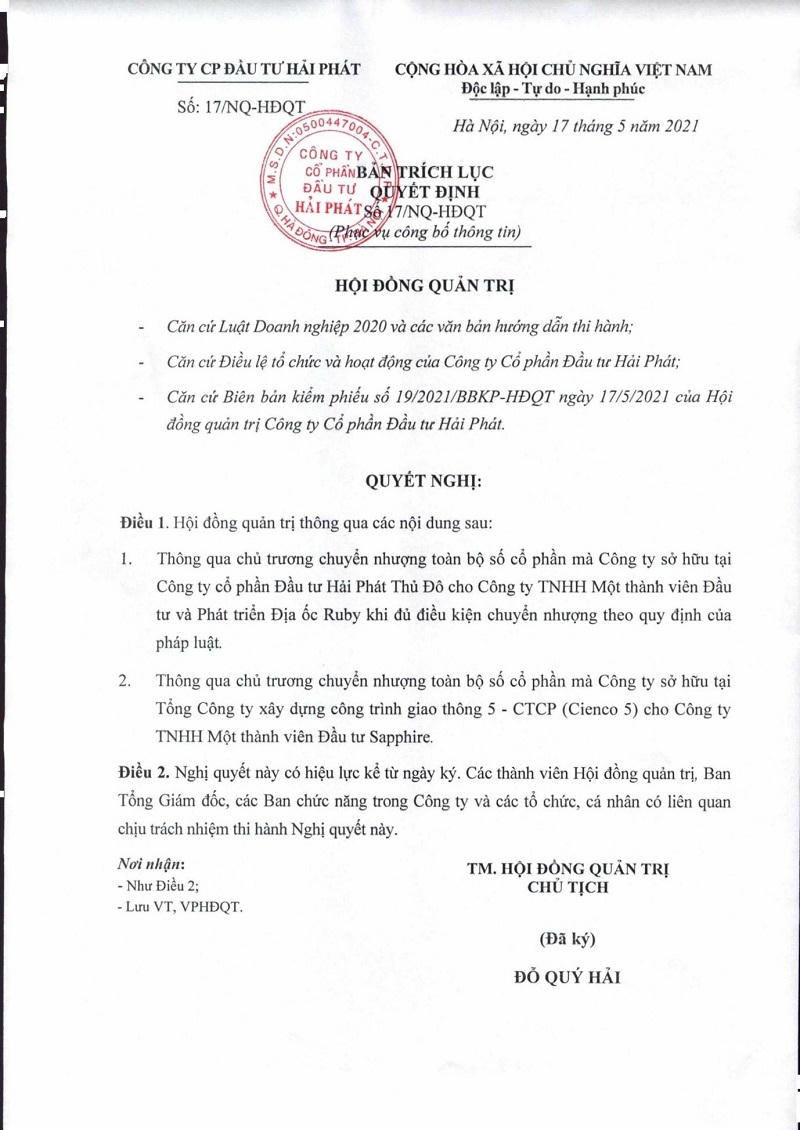 Theo đó, HĐQT của Hải Phát đã thông qua chủ trương chuyển nhượng toàn bộ số cổ phần mà Công ty sở hữu tại Công ty CP Đầu tư Hải Phát Thủ Đô cho Công ty TNHH MTV Đầu tư và Phát triển địa ốc Ruby khi đủ điều kiện chuyển nhượng theo quy định của pháp luật. Đồng thời, HĐQT công ty cũng đã thông qua chủ trương chuyển nhượng toàn bộ số cổ phần mà Công ty sở hữu tại Tổng công ty Xây dựng công trình giao thông 5 – CTCP (Cienco 5) cho Công ty TNHH MTV Đầu tư Sapphire.