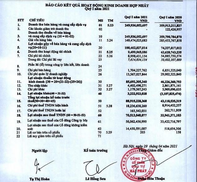 Về hoạt động kinh doanh, kết thúc quý I/2021, Hải Phát của ông Đỗ Quý Hải ghi nhận doanh thu thuần 250 tỷ đồng, giảm 31% so với cùng kỳ, do doanh thu kinh doanh bất động sản giảm 77% còn 66,5 tỷ đồng. Tuy nhiên, doanh thu hoạt động khác (không thuyết minh) tăng 116% lên 183 tỷ đồng. Giá vốn giảm 48%, theo đó biên lãi gộp cải thiện từ 21% lên 40%.