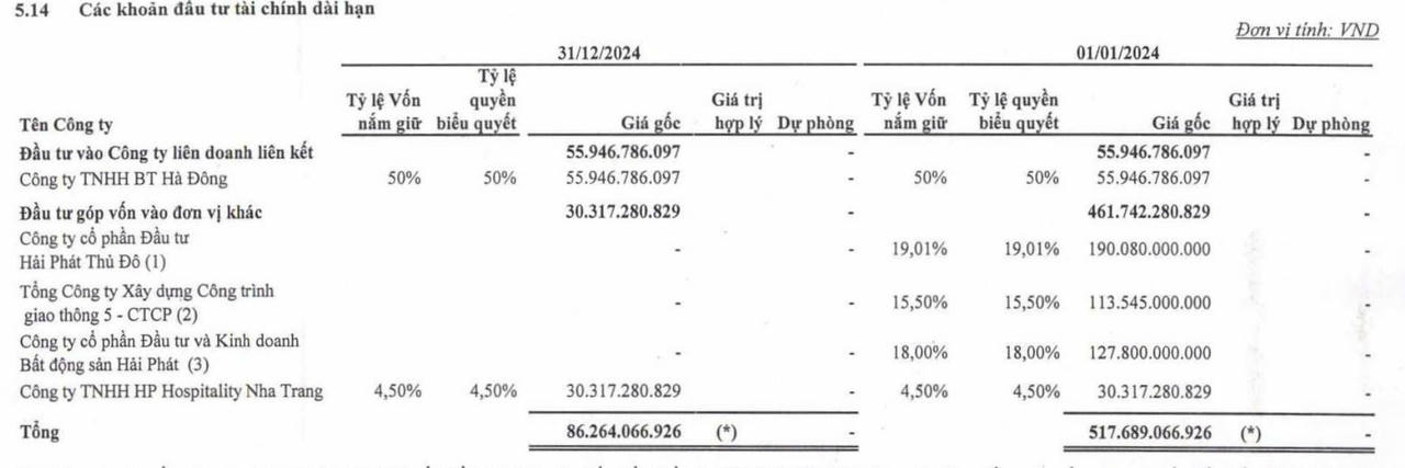 Dự phòng thu ngắn hạn khó đòi tăng 2,2 lần, lên gần 89 tỷ đồng, phần lớn do trích lập 50 tỷ cho khoản nợ từ Công ty CP Đầu tư Solaris Việt Nam. Hải Phát cũng gần như rút hết khỏi các khoản đầu tư khác, chỉ còn giữ khoản góp vốn 30 tỷ đồng vào HP Hospitality Nha Trang (tương đương 4,5% vốn điều lệ tại đây).