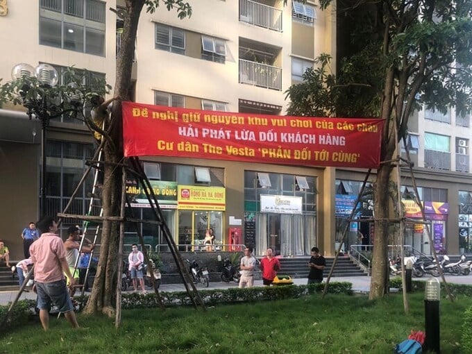 Không nhất trí với việc phá bỏ khu vui chơi để xây dựng bãi đỗ xe, cư dân tại chung cư The Vesta đồng loạt căng băng rôn đỏ để phản đối chủ đầu tư. Đồng thời, cư dân cũng tố Hải Phát Invest lừa đảo khách hàng, vi phạm trật tự xây dựng,...