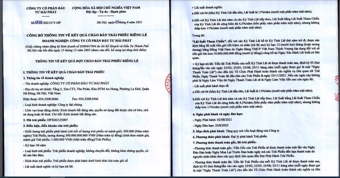 Riêng đầu năm 2021 đến nay, công ty đã huy động cả nghìn tỷ đồng. Cụ thể, trong tháng 5/2021, Hải Phát Invest đã hai lần phát hành trái phiếu với tổng số tiền 750 tỷ đồng.