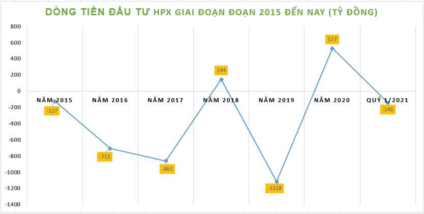 Bên cạnh đó, dòng tiền đầu tư cũng liên tục âm. Từ giai đoạn 2015 đến nay, dòng tiền đầu tư của doanh nghiệp liên tục ở mức âm, chỉ trong 2 năm là 2018 và 2020 là ở mức dương.