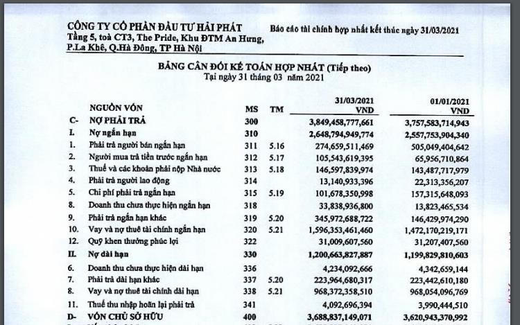 Theo BCTC Hợp nhất quý 1/2021 của HPX, tính đến cuối tháng 3/2021, nợ phải trả của doanh nghiệp đạt 3.849 tỉ đồng, tăng 2,4% so với đầu năm. Trong đó, dư nợ vay và nợ thuê tài chính là 2.564 tỉ đồng, chiếm 34% tổng nguồn vốn.