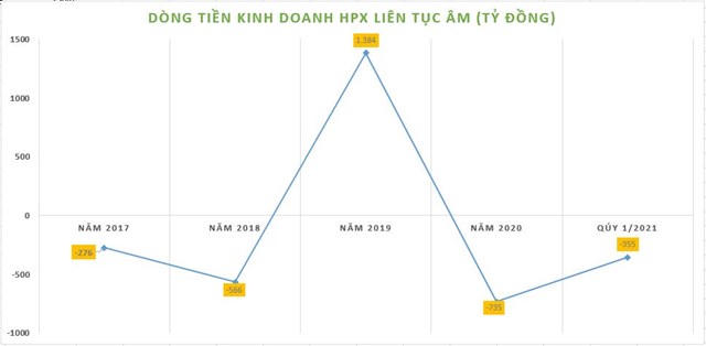 Cụ thể, từ năm 2017 đến nay, chỉ duy nhất năm 2019 dòng tiền kinh doanh của doanh nghiệp dương với 1.384 tỷ đồng. Còn lại những năm 2017, 2018, 2020 và quý 1/2021 ghi nhận đều ở mức âm.