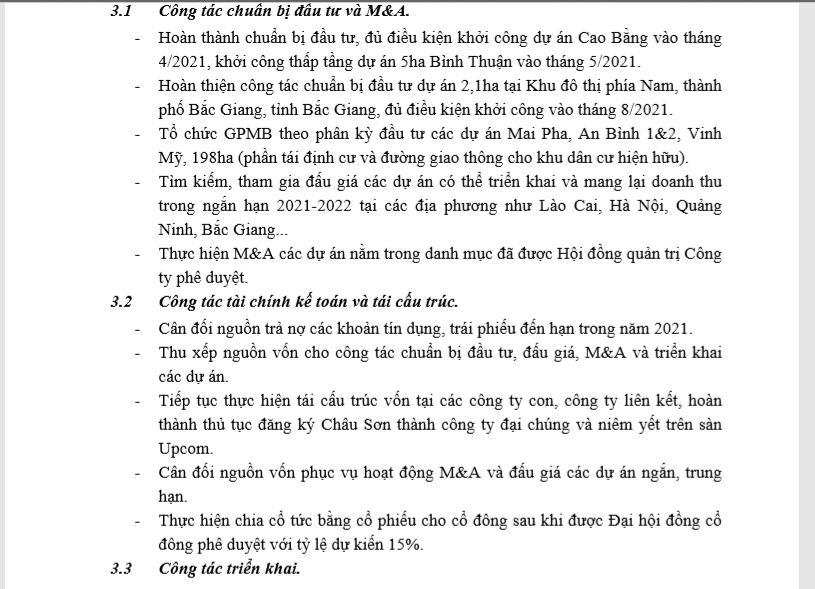 Doanh nghiệp dự kiến sẽ hoàn thiện công tác chuẩn bị đầu tư dự án 2,1ha tại Khu đô thị phía Nam, thành phố Bắc Giang, tỉnh Bắc Giang để đủ điều kiện khởi công vào tháng 8/2021. Đồng thời tiến thành GPMB theo phân kỳ đầu tư các dự án Mai Pha, An Bình 1&2, Vinh Mỹ.