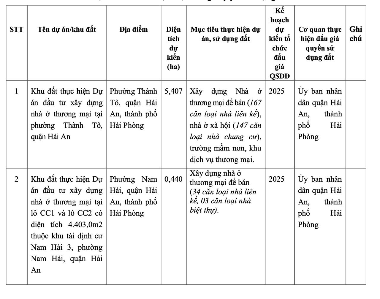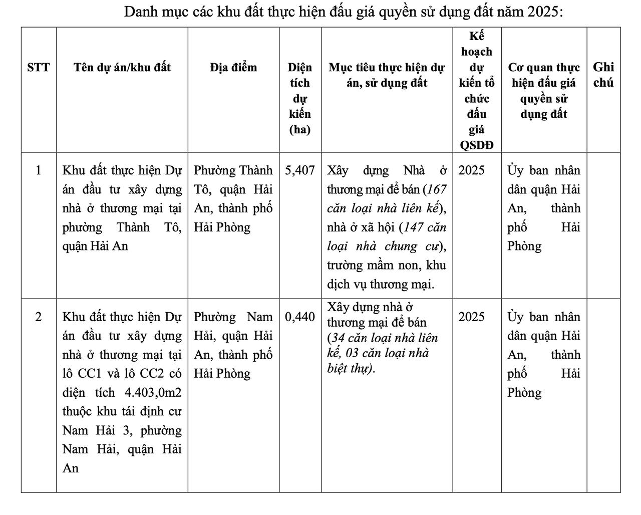 Theo văn bản công bố kế hoạch các khu đất, danh mục thực hiện đấu giá quyền sử dụng đất trên địa bàn quận Hải An năm 2025 ngày 31/12/2024, năm 2025, UBND quận Hải An dự kiến đưa 4 khu đất và đấu giá quyền sử dụng đất với tổng diện tích: 61.451 m2 tại các phường Thành Tô, Nam Hải, Đằng Hải, Đông Hải 2.