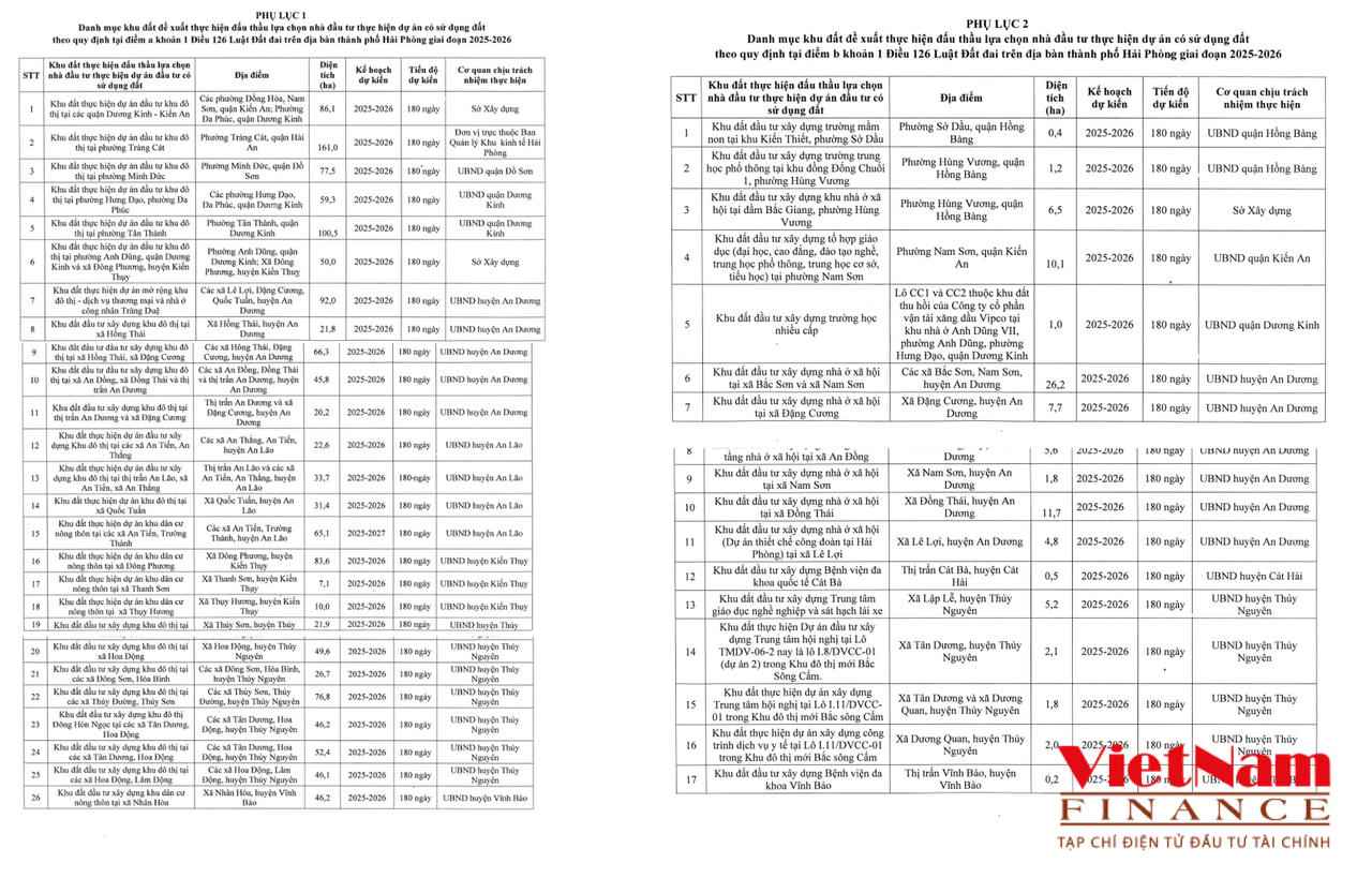 Tại kỳ họp thứ 22 (kỳ họp chuyên đề) diễn ra vào ngày 30/12/2024, HĐND TP. Hải Phòng đã ban hành nghị quyết về danh mục các khu đất thực hiện đấu thầu dự án đầu tư có sử dụng đất trên địa bàn thành phố Hải Phòng giai đoạn 2025-2026 đối với 43 khu đất, trong đó, có 26 khu là các dự án đầu tư xây dựng khu đô thị khu dân cư nông thôn và 17 khu phải đấu thầu lựa chọn nhà đầu tư theo quy định pháp luật chuyên ngành lĩnh vực.