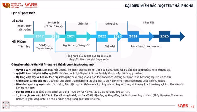 Phát biểu tại buổi công bố báo cáo, ông Nguyễn Đình Cương, Trưởng ban Nghiên cứu thị trường và Tư vấn xúc tiến đầu tư của Hội Môi giới Bất động sản Việt Nam (VARS) khẳng định: Hải Phòng đang nổi lên là điểm sáng mới trên bản đồ bất động sản miền Bắc, đặc biệt sau sự kiện sáp nhập với tỉnh Hải Dương.