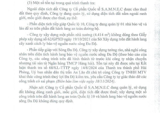 Thanh tra đã chỉ ra loạt vi phạm trong quản lý, sử dụng đất và xây dựng trái phép, xâm phạm hành lang bảo vệ sông, giao thông của Công ty Quốc tế S.A.M.N.E.C.