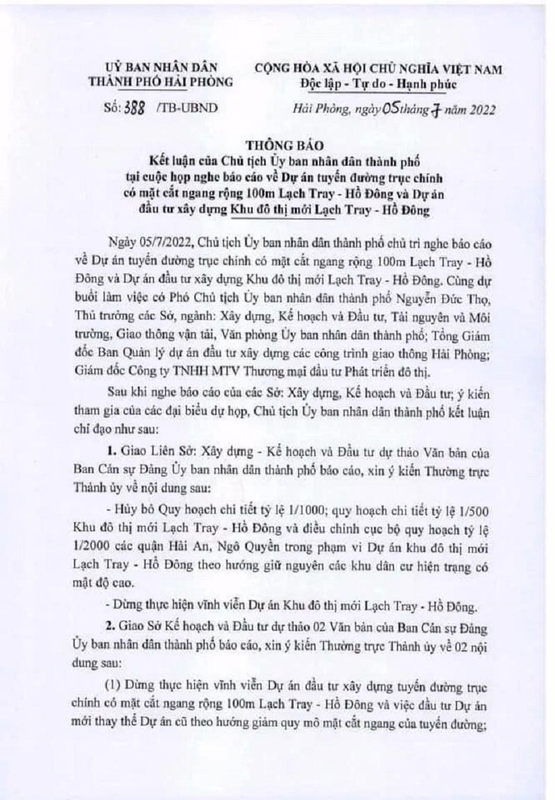 Trước đó, Ban Cán sự đảng UBND TP Hải Phòng cũng xin ý kiến Thành ủy Hải Phòng về chủ trương dừng thực hiện vĩnh viễn Dự án đầu tư xây dựng tuyến đường trục chính có mặt cắt ngang rộng 100m Lạch Tray - Hồ Đông và việc đầu tư Dự án mới thay thế Dự án cũ theo hướng giảm quy mô mặt cắt ngang của tuyến đường; xem xét, tính toán hoàn trả số tiền Công ty TNHH MTV Thương mại đầu tư Phát triển đô thị đã đầu tư.