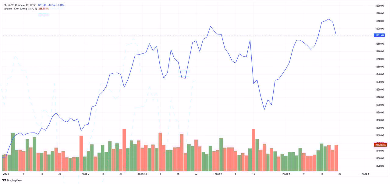 Thống kê cho thấy lần gần nhất chỉ số VN30-Index giảm trên 1% là trong phiên giao dịch 19/4/2024. Và sau tới 1 tháng, chỉ số này mới lại chứng kiến một phiên giảm trên 1%. Cụ thể, trong phiên 22/5, chỉ số VN30-Index đã giảm 17,16 điểm, tương đương 1,31%, xuống 1.291,46 điểm.
