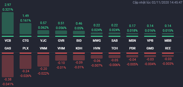 Thị trường chứng khoán tăng điểm mạnh vào cuối phiên 2/11 nhờ sự bứt phá của loạt cổ phiếu trụ cột. Nhiều cổ phiếu bất động sản thanh khoản cao cũng bứt phá theo thị trường chung.