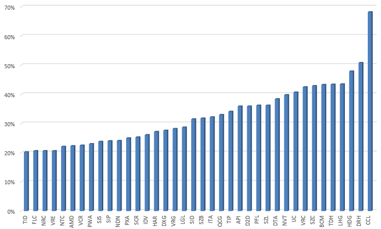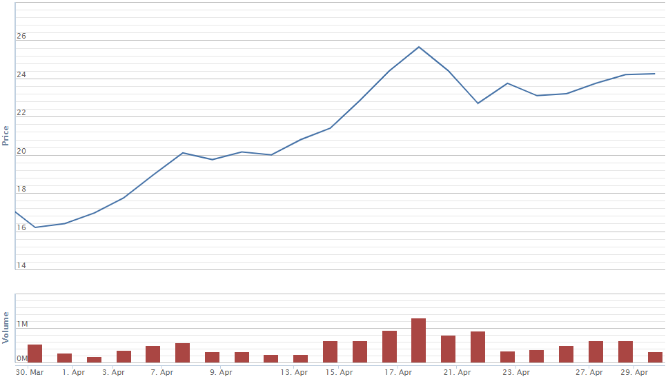 Đứng đầu danh sách tăng giá của nhóm cổ phiếu bất động sản là CCL của ĐT&PT Dầu khí Cửu Long với mức tăng 68,2%. Giá cổ phiếu CCL đã tăng từ 3.930 đồng/cp lên thành 6.610 đồng/cp. Giá cổ phiếu CCL tăng mạnh trong tháng 4 trước bối cảnh kết quả kinh doanh quý I của doanh nghiệp này là khá tốt dù nền kinh tế bị ảnh hưởng bởi dịch Covid-19. CCL lãi sau thuế quý I gần 20 tỷ đồng, gấp 2,2 lần cùng kỳ năm trước. Bên cạnh đó, một thông tin cũng tác động đáng kể giúp giá cổ phiếu này đi lên đó là việc ông Nguyễn Triệu Dũng đã mua vào 2,14 triệu cổ phiếu CCL trong khoảng thời gian từ 6/4 đến 22/4/2020.