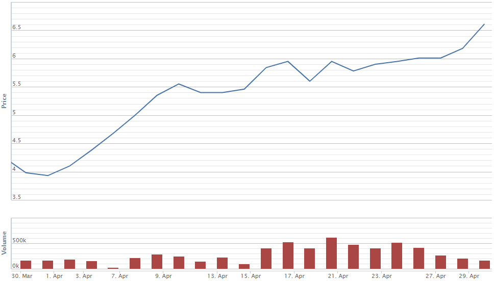 Diễn biến giá cổ phiếu DRH trong tháng 4.Nguồn: VNDirect.