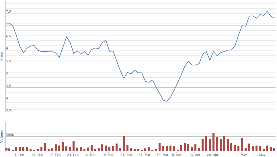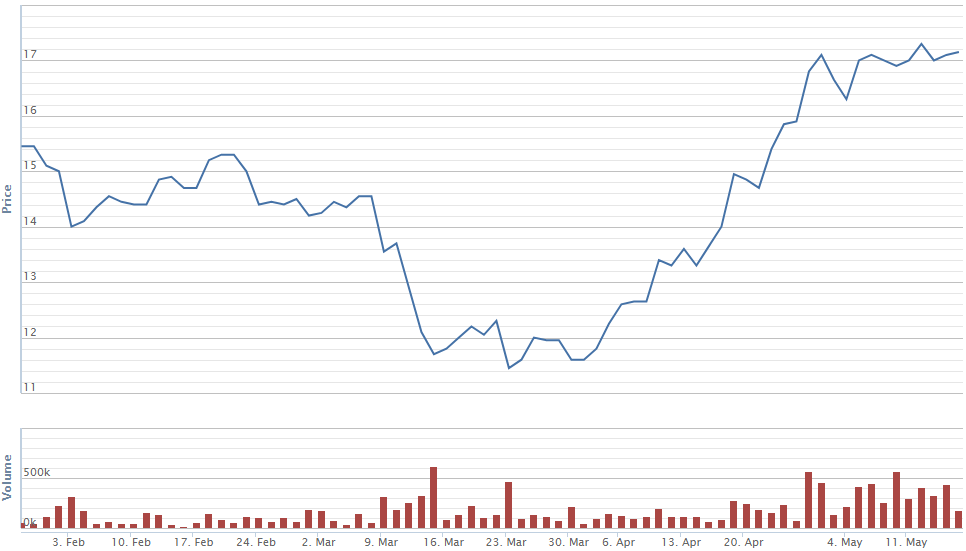Tiếp đến là cổ phiếu LHG với mức tăng 11% so với trước dịch Covi-19. Cổ phiếu này cũng tăng 48% so với đầu tháng 4. Việc cổ phiếu LHG tăng giá rất mạnh thời gian gần đây do trùng với thời điểm thị trường chung hồi phục cùng với những câu chuyện riêng của ngành bất động sản khu công nghiệp. Theo đó, trong khi rất nhiều ngành bị ảnh hưởng nặng nề bởi dịch Covid-19 và khó khăn để hồi phục thì bất động sản khu công nghiệp lại được cho rằng sẽ phục hồi nhanh hơn so với các ngành khác nhờ vào sự chuyển dịch dòng vốn đầu tư vào sản xuất từ Trung Quốc sang Việt Nam và các hiệp định thương mại tự do sắp tới của Việt Nam.