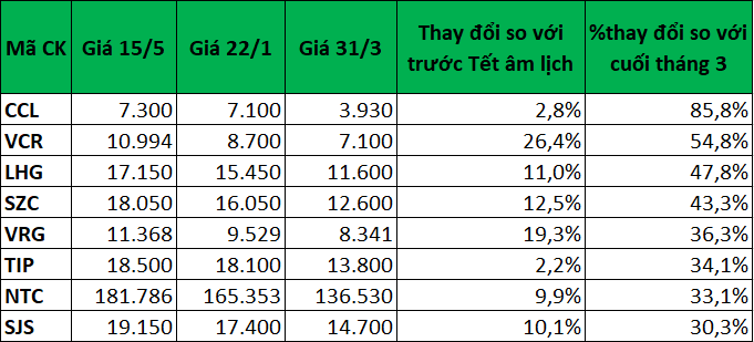 Riêng trong nhóm cổ phiếu bất động sản, các cái tên đã vượt qua cả mức giá trước thời điểm Tết âm lịch sau quãng thời gian giảm sốc do ảnh hưởng từ dịch bệnh là ĐT&PT Dầu khí Cửu Long (CCL), Vinaconex - ITC (VCR), KCN Long Hậu (LHG), Sonadezi Châu Đức (SZC), PT Đô thị và KCN Cao su VN (VRG), PT KCN Tín Nghĩa (TIP), KCN Nam Tân Uyên (NTC), SUDICO (SJS) hay Năm Bảy Bảy (NBB)…