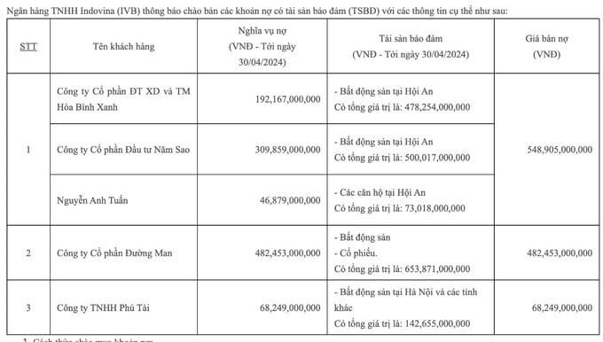 Tài sản bảo đảm của khoản nợ bao gồm bất động sản và cổ phiếu có tổng giá trị hơn 653 tỷ đồng. Giá bán khoản nợ mà ngân hàng đưa ra tương đương với giá trị nợ. Thời gian nhận hồ sơ của tổ chức, cá nhân có nhu cầu mua khoản nợ đến ngày 31/5.