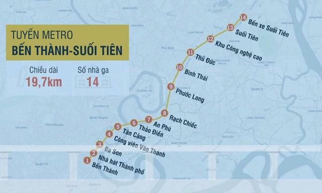 Tương tự tuyến đường sắt đô thị Bến Thành (quận 1) – Suối Tiên (quận 9), còn gọi là tuyến Metro số 1 được khởi công vào năm 2012, hiện đã hoàn thành 90% tiến độ thi công, dự kiến vận hành thương mại trong năm 2022. Tuyến đường dài 19,7 km đi qua các quận 1, 2, 9 Bình Thạnh, Thủ Đức (TP.HCM) và TP Dĩ An (Bình Dương).