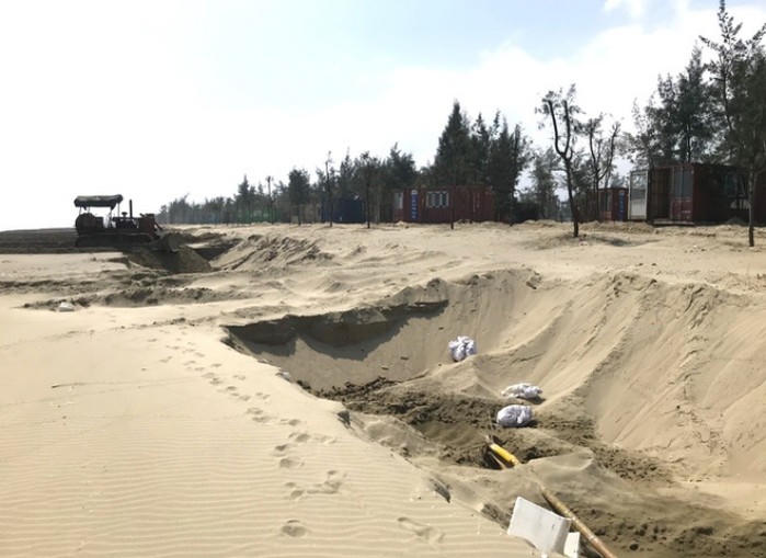Không những thế, nhiều hố cát trên bãi biển sâu hoắm sau khi bị đơn vị thi công này múc cát để vào làm trong dự án. Cả 1 bãi biển rộng lớn bị ủi cát tan hoang, tạo ra những rãnh lớn nham nhở.