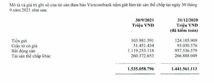 Lượng bất động sản được thế chấp tại Vietcombank tính đến 30/9/2021 đạt mức 1,119 triệu tỷ đồng, chiếm tới 73% tổng tài sản thế chấp.