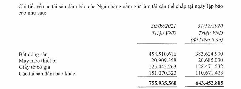 Cụ thể, tại báo cáo tài chính hợp nhất quý 3/2021 tại một số ngân hàng quy mô vừa và lớn cho thấy, rất ít nhà băng đề cập tới số liệu về tài sản thế chấp, cầm cố.
