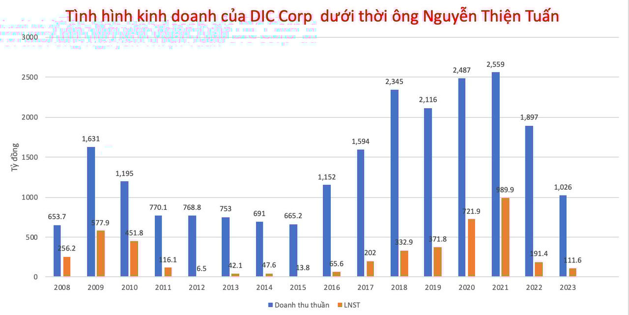 Đến năm 2023, tình hình kinh doanh của DIC Corp bắt đầu có sự giảm sút do khó khăn chung của thị trường. Dù vậy, doanh nghiệp vẫn đạt 1.026 tỷ doanh thu và 116 tỷ lợi nhuận ròng.