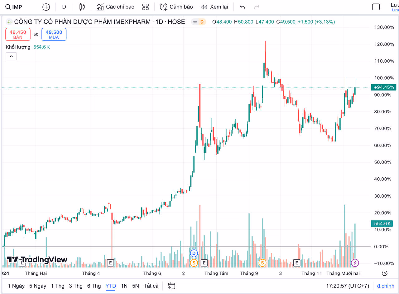 Nếu như Imexpharm đang từng bước vươn mình ra toàn cầu, thì cổ phiếu IMP trên thị trường chứng khoán cũng không kém phần tích cực. Kể từ đầu năm đến nay, IMP ghi nhận tăng đến 94%, từ mức 25.590 đồng/cổ phiếu (giá điều chỉnh phiên 2/1/2024) lên mức 49.500 đồng/cổ phiếu (giá đóng cửa phiên 12/12).