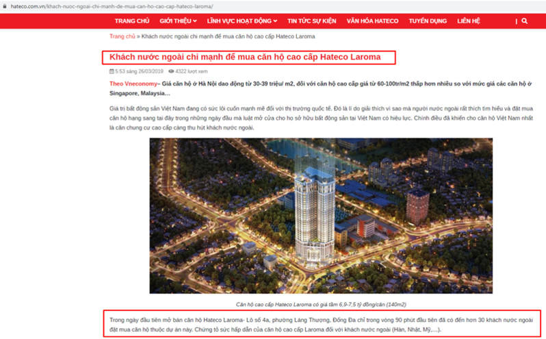 Cũng trên trang web https://hateco.com.vn/ có ghi nhận thông tin: Trong ngày đầu tiên mở bán căn hộ Hateco Laroma- Lô số 4a, phường Láng Thượng, Đống Đa chỉ trong vòng 90 phút đầu tiên đã có đến hơn 30 khách nước ngoài đặt mua căn hộ thuộc dự án này. Chứng tỏ sức hấp dẫn của căn hộ cao cấp Laroma đối với khách nước ngoài (Hàn, Nhật, Mỹ,…).