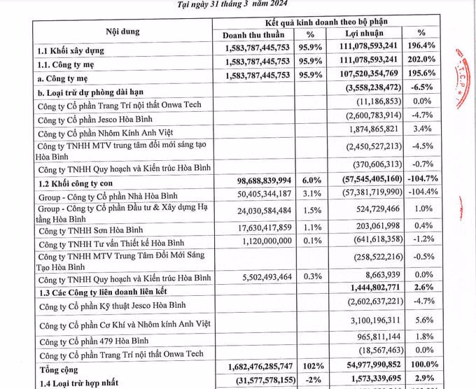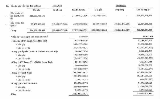 Trước đó, theo thông tin từ báo cáo tài chính Quý I/2024 Công ty Cổ phần Tập đoàn Xây dựng Hoà Bình cho thấy, tính đến ngày 31/3/2024, công ty này đã góp vốn vào Công ty Cổ phần Kỹ thuật Jesco Hoà Bình hơn 34,8 tỷ đồng, lỗ lũy kế của công ty này hơn 25,3 tỷ đồng. Đồng thời, góp vốn vào Công ty Cổ phần Cơ khí và Nhôm kính Anh Việt hơn 19,5 tỷ đồng, lỗ lũy kế gần 7,5 tỷ đồng.