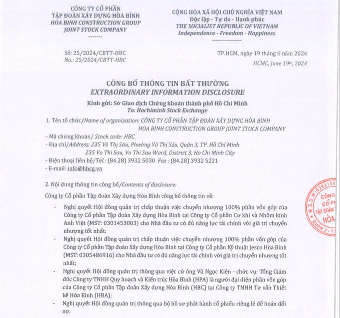 Ngày 19/6, Công ty Cổ phần Tập đoàn Xây dựng Hoà Bình (mã chứng khoán: HBC) đã công bố thông tin bất thường về Nghị quyết HĐQT chấp thuận việc chuyển nhượng 100% vốn góp của HBC tại Công ty Cổ phần Cơ khí và Nhôm kính Anh Việt, mã số thuế 0301453003 và Công ty Cổ phần Kỹ thuật Jesco Hoà Bình mã số thuế 0305486916 cho nhà đầu tư có đủ năng lực tài chính với giá trị chuyển nhượng tốt nhất.