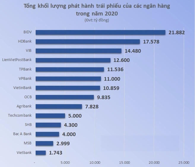 Trong năm 2020, HDBank là ngân hàng phát hành trái phiếu cao thứ hai toàn ngành, xếp sau BIDV, với gần 17.600 tỷ đồng, theo IB VietinBank.