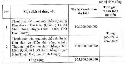 Ngoài ra, NRC sẽ chi 180 tỷ đồng mua một phần dự án khu dân cư tiểu thủ công nghiệp thương mại dịch vụ Hàm Thắng - Hàm Liêm (huyện Hàm Thuận Bắc, Bình Thuận). Việc triển khai mua lại các bất động sản nêu trên dự kiến được Danh Khôi thực hiện trong quý IV/2024 và năm 2025.