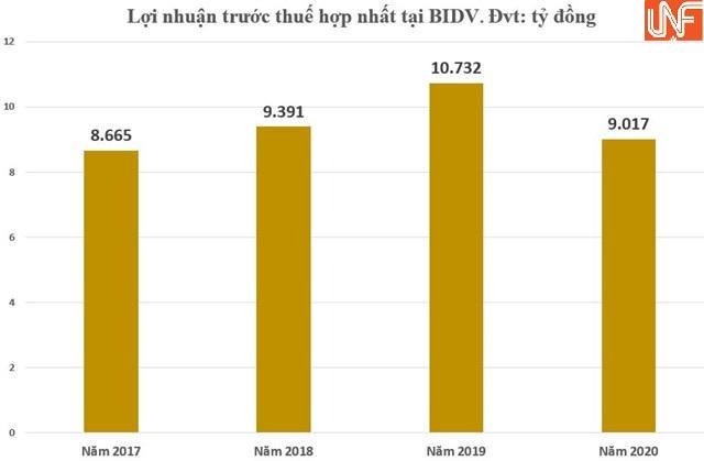 Cụ thể, trong năm 2020, lợi nhuận trước thuế hợp nhất của BIDV đạt 9.017 tỷ đồng, giảm khoảng 16% so với năm 2019. Lợi nhuận trước thuế riêng lẻ đạt 8.515 tỷ đồng, giảm 17,3%. Lợi nhuận năm 2020 giảm so với năm 2019 do BIDV giảm thu nhập hơn 6.400 tỷ đồng để thực hiện cơ cấu nợ, hạ lãi suất và miễn giãm lãi, phí để hỗ trợ doanh nghiệp và người dân.