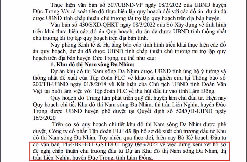 Văn bản có nêu rõ, dự án án được UBND tỉnh ủng hộ ý tưởng và thống nhất đề xuất của Tập đoàn FLC khảo sát nghiên cứu tại Thông báo số 200/TB-UBND ngày 01/8/2018 về Kết luận của Chủ tịch UBND tỉnh Đoàn Văn Việt tại buổi làm việc với Tập đoàn FLC liên quan đến việc thu hút đầu tư vào tỉnh Lâm Đồng.