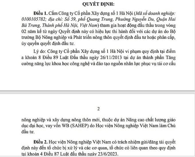 Đáng chú ý, ngày 27/3/2024, Bộ NN&PTNT đã ra Quyết định số 850/QĐ-BNN-XD cấm thầu 2 năm đối với Công ty CP Xây dựng số 1 Hà Nội (HACC1) do chuyển nhượng thầu trái phép.