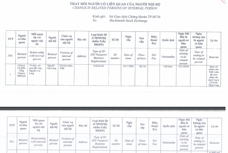 Mới đây, Công ty Cổ phần Tài Nguyên (MCK: TNT) có văn bản gửi Sở Giao dịch Chứng khoán TP.Hồ Chí Minh (HSX) thông báo về việc thay đổi người có liên quan của người nội bộ. Ông Nguyễn Gia Long – Chủ tịch kiêm Tổng Giám đốc TNT được bổ nhiệm là Tổng Giám đốc kiêm đại diện pháp luật của MBLand Holdings từ 6/11/2018.