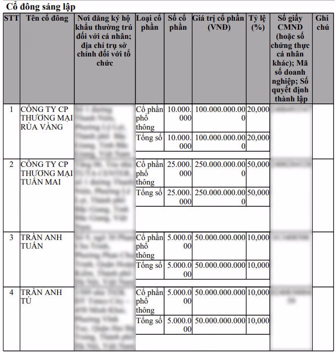 Trong đó, Công ty cổ phần thương mại Tuấn Mai được thành lập vào tháng 2/2007. Doanh nghiệp này ban đầu cũng có vốn điều lệ là 25 tỷ đồng.