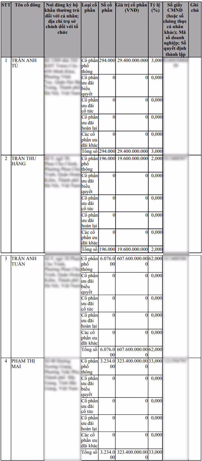 Đến tháng 11/2020, vốn điều lệ của Công ty cổ phần thương mại Tuấn Mai tiếp tục được nâng lên thành 980 tỷ đồng. Danh sách cổ đông lúc này gồm: Trần Anh Tú góp 29,4 tỷ đồng, sở hữu 3% cổ phần; Trần Thu Hằng góp 19,6 tỷ đồng, sở hữu 2% cổ phần; Trần Anh Tuấn góp 607,6 tỷ đồng, sở hữu 62% cổ phần; Phạm Thị Mai góp 323,4 tỷ đồng, sở hữu 33% cổ phần còn lại.