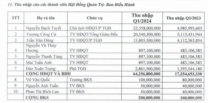 Trong số này, bà Nguyễn Bạch Tuyết, Chủ tịch HĐQT kiêm Phó tổng giám đốc nhận thu nhập lên đến hơn 22 tỷ đồng trong quý đầu năm, trong khi cùng kỳ chỉ nhận gần 5 tỷ đồng.
