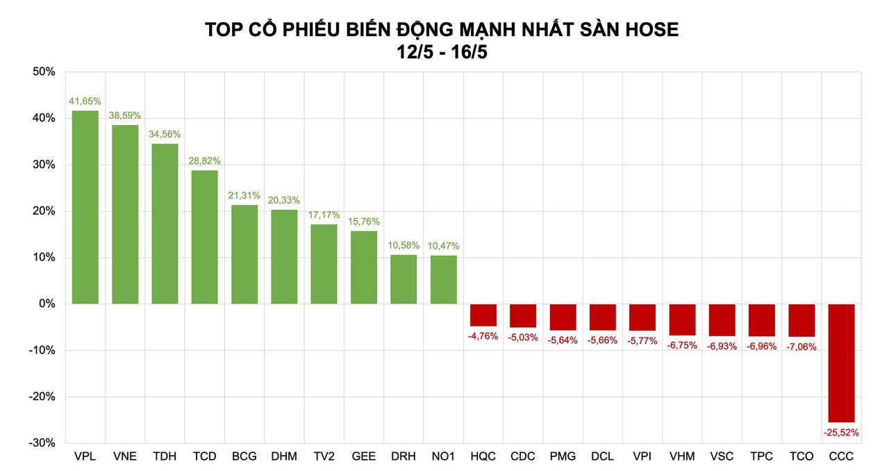 Ở chiều ngược lại, nhóm giảm giá mạnh nhất trên HoSE trong tuần qua bao gồm CCC (−25,52%), TCO (−7,06%), TPC (−6,96%), VSC (−6,93%), VHM (−6,90%), VPI (−5,77%), DCL (−5,66%), PMG (−5,64%), CDC (−5,03%) và HQC (−4,76%).